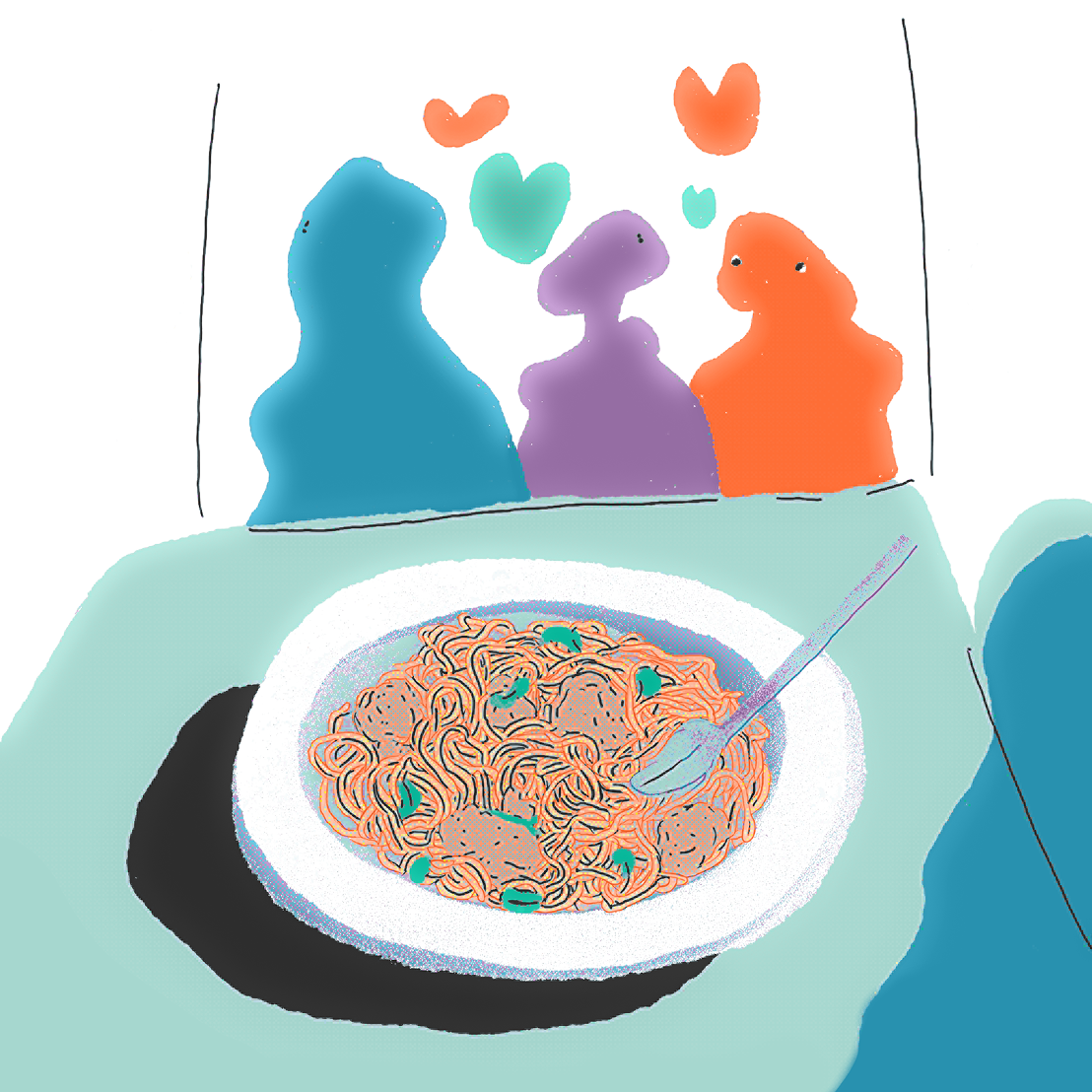 1. Take vegan canned bolognese mince. 2. Heat water with a kettle and boil instant noodles. 3. Add noodles to the mince. 4. Season with herbs and onions.