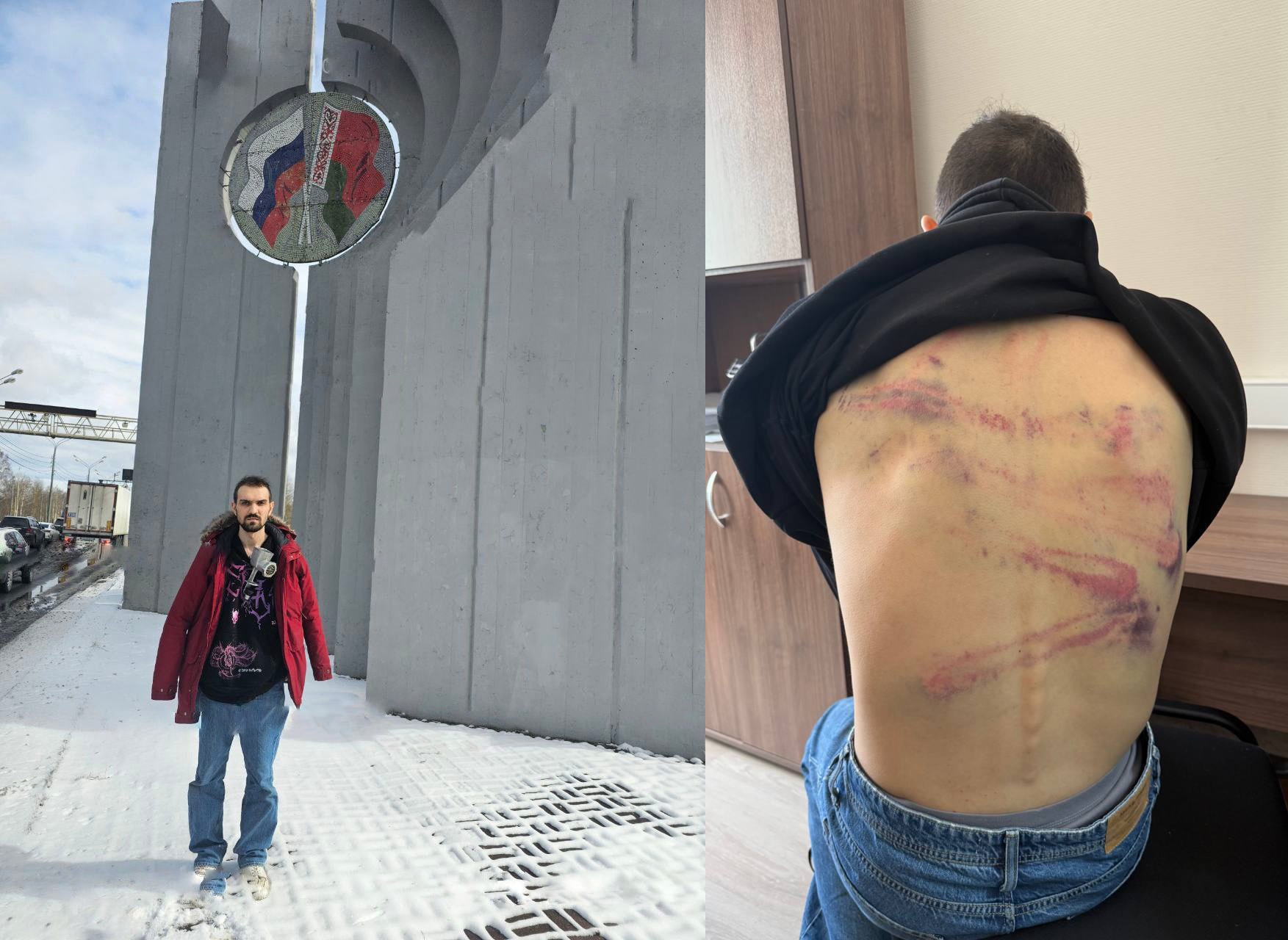 1 — Artemi Ostanin with a meat grinder around his neck at the Russian-Belarusian border / Photo: Ministry of Internal Affairs of Belarus; 2 — Beating marks on his body / Photo: Eva Merkacheva’s Telegram channel |